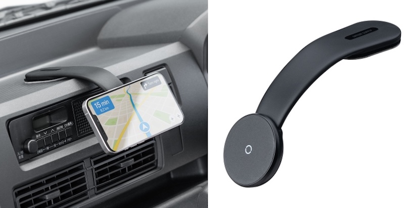 粘着テープと面ファスナーを利用して車のダッシュボードなどに設置できる付け外し可能なスマートフォン用ホルダーで、180°まで曲がるフレキシブルアームを採用しています。