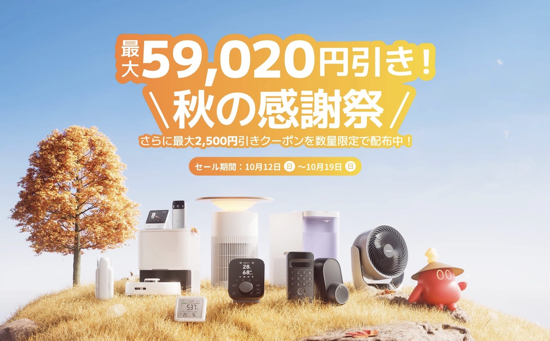 SwitchBot株式会社が、10月19日(日)まで対象製品を最大59,020円引きで提供する「秋の感謝祭
