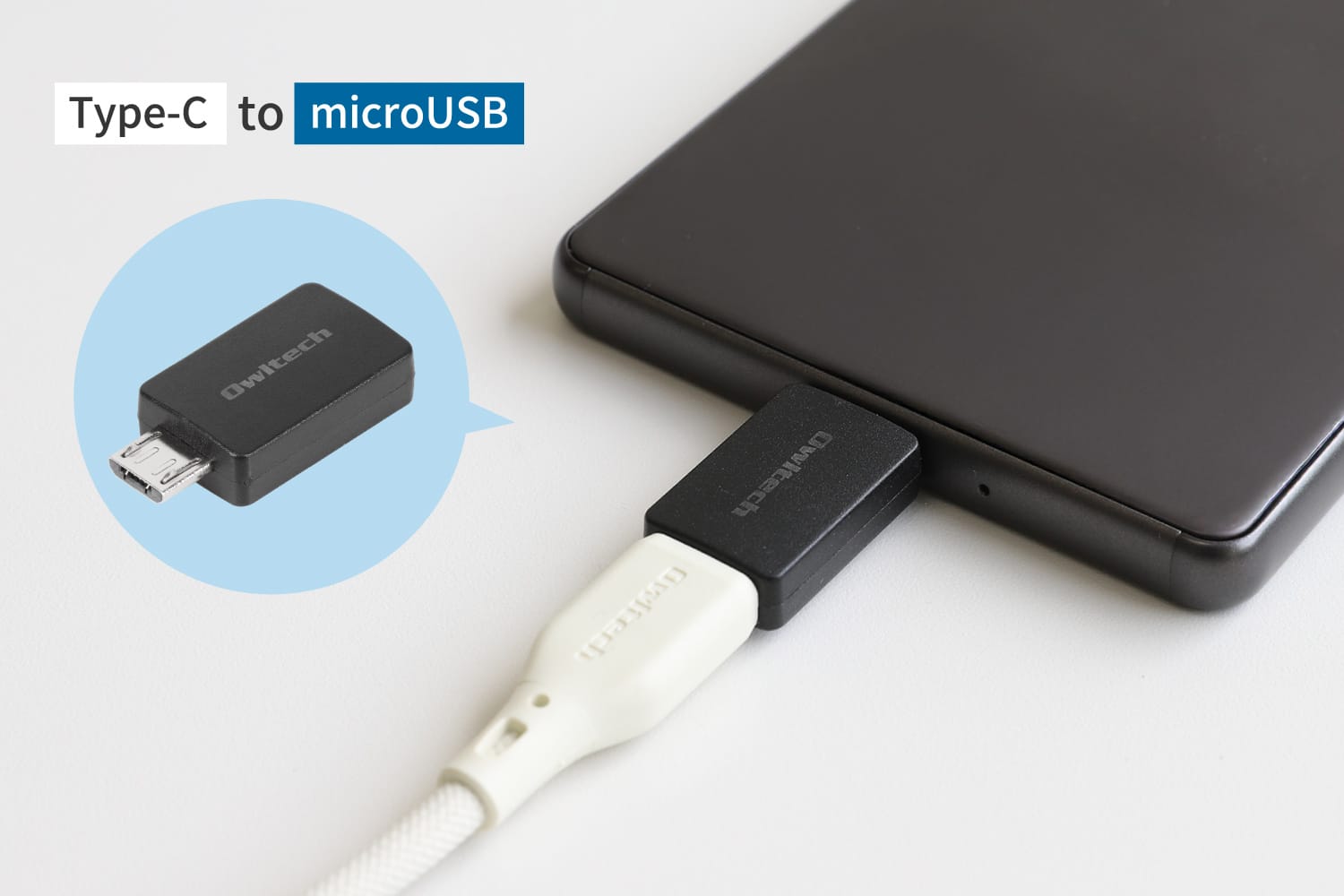 OWL-ADCFB01-BKは、USB-CコネクタをmicroUSBコネクタに変換できるアダプタです。最大3Aの充電と、最大480Mbpsのデータ転送に対応しています。