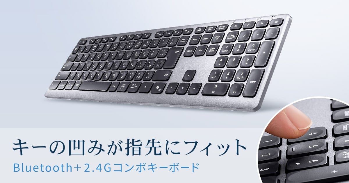 SKB-WBT41BKは、112キー日本語109A配列のフルサイズキーボードです。Bluetooth接続と2.4GHzワイヤレス接続(レシーバーはUSB-A接続)に対応しており、3台のデバイスを切り替えながら使用できます。