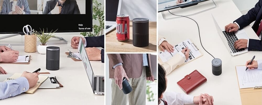 LBT-SP02M2BKは、350ml缶と同等サイズの円筒形デザインで、4~6人でのウェブ会議に適したスピーカーフォンです。