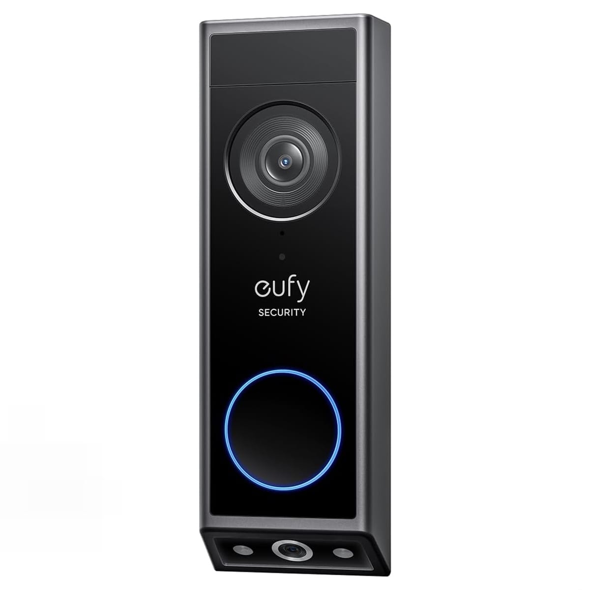 Eufy Video Doorbell E340は、スマートフォンで映像と音声による訪問者応対が可能なドアホンで、正面のカメラで訪問者を、下向きのカメラで足元の荷物を確認できるデュアルカメラを搭載しています。