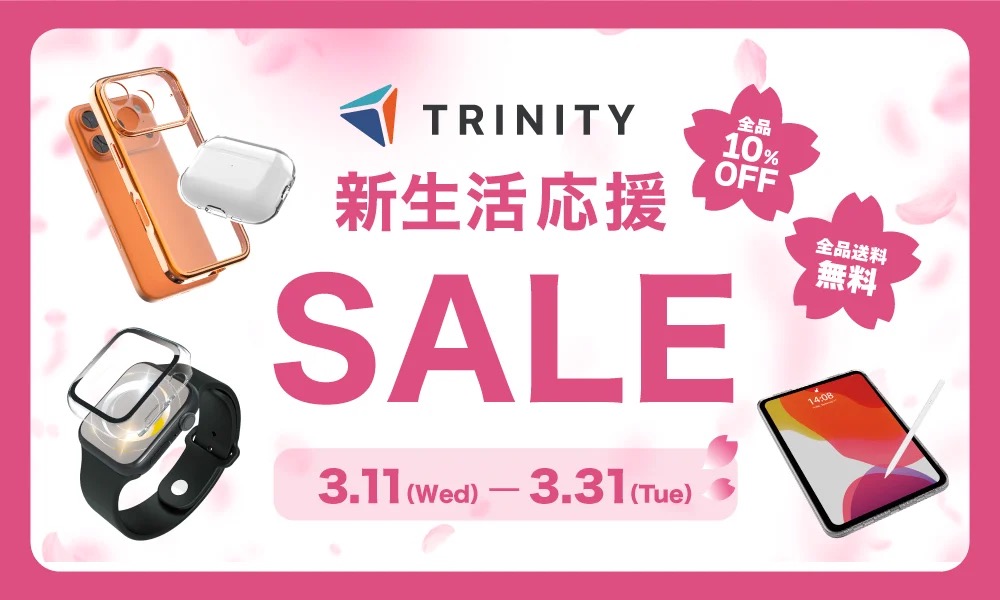 セール/キャンペーン トリニティ、全品10%オフの「新生活応援セール」開催 2026年3月11日(水)20:52 当サイトはアフィリエイトによる収益を得ており、アフィリエイトリンクが含まれている場合があります。 トリニティ株式会社が、ホアクセサリーなどを10%オフで提供する「新生活応援セール」を開催しています。 SimplismブランドやBesperプランドなどのiPhone/iPad/Apple Watch/AirPods用アクセサリーなど全品が対象です。 実施期間は3月31日(火)までです。