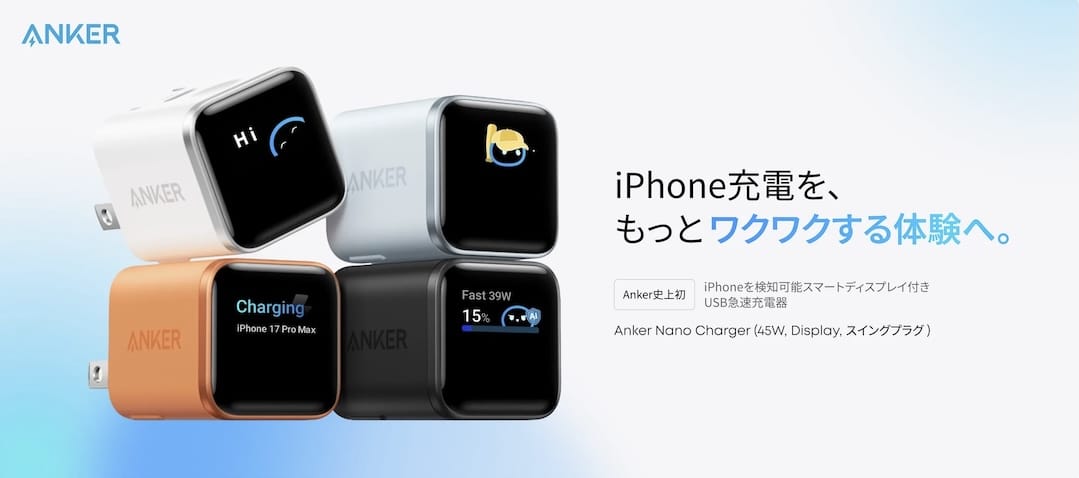 アンカー・ジャパン株式会社が、iPhoneを検知可能なスマートディスプレイ付きUSB-C充電器「Anker Nano Charger (45W, Display, スイングプラグ)」を発売すると発表しています。