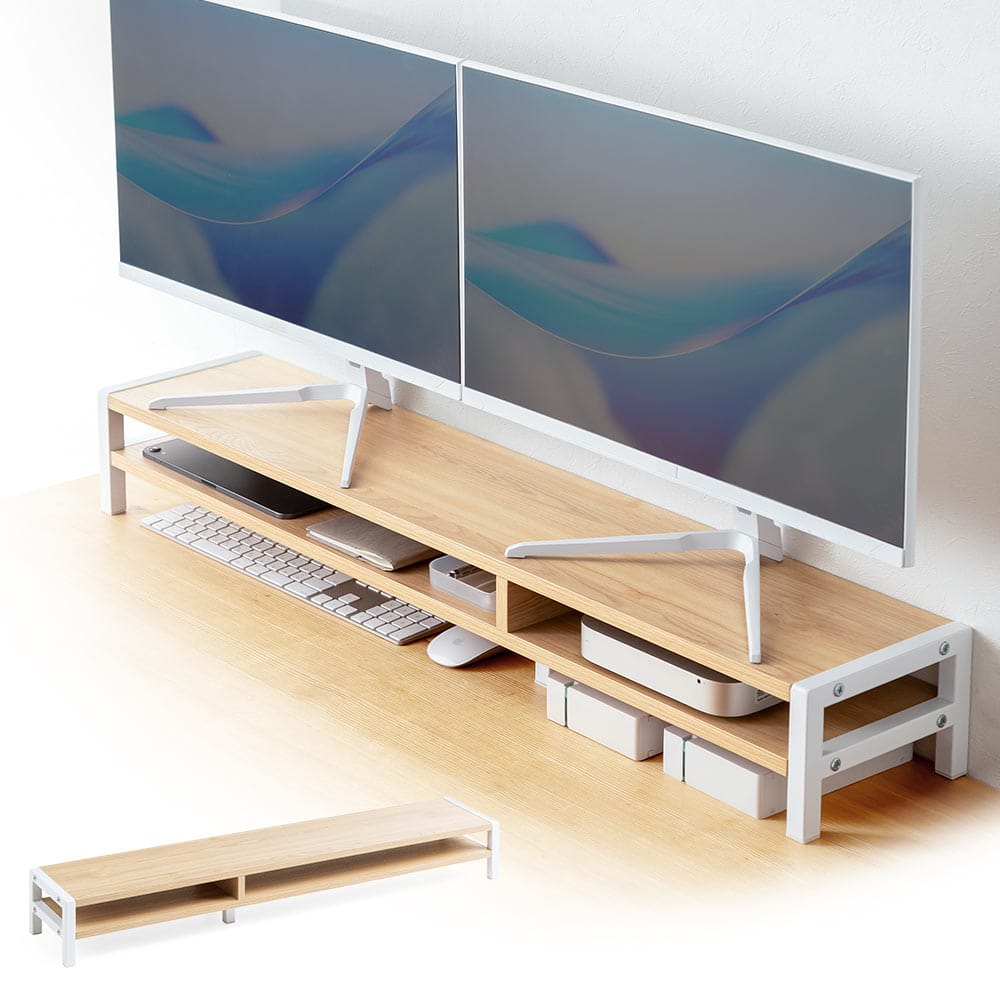 EEX-DES33は、モニター2台を並べて置いたり、ワイドモニターも設置できる横幅100cmのモニター台です。中棚付きの2段式で周辺機器なども収納できます。