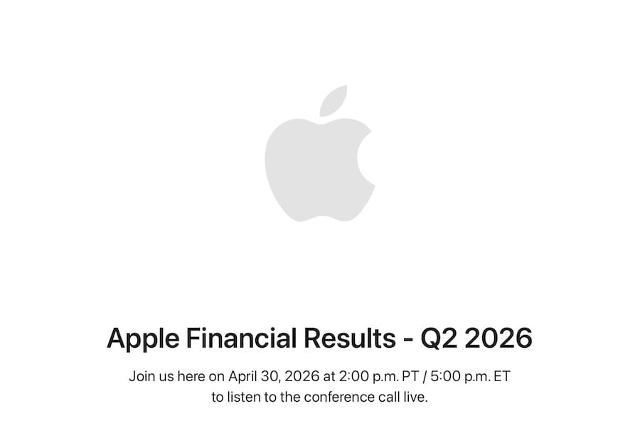 Apple Inc.が、日本時間5月1日(金)午前6時より、2026年度第2四半期(2026年1〜3月)の業績発表に伴うカンファレンスコールをライブで配信すると案内しています。