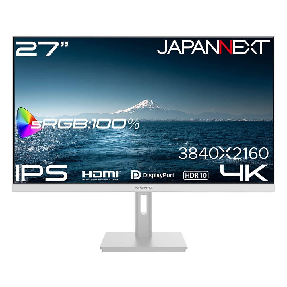 ホワイトカラーの27インチ4Kモニター。非光沢IPS(ADS)パネルを搭載、表示色10.7億色、sRGBカバー率100%、最大輝度350cd/m²、コントラスト比1,000:1、リフレッシュレート60Hz。DisplayPort、HDMI×2搭載、スピーカー(2W×2)内蔵。VESA100対応。