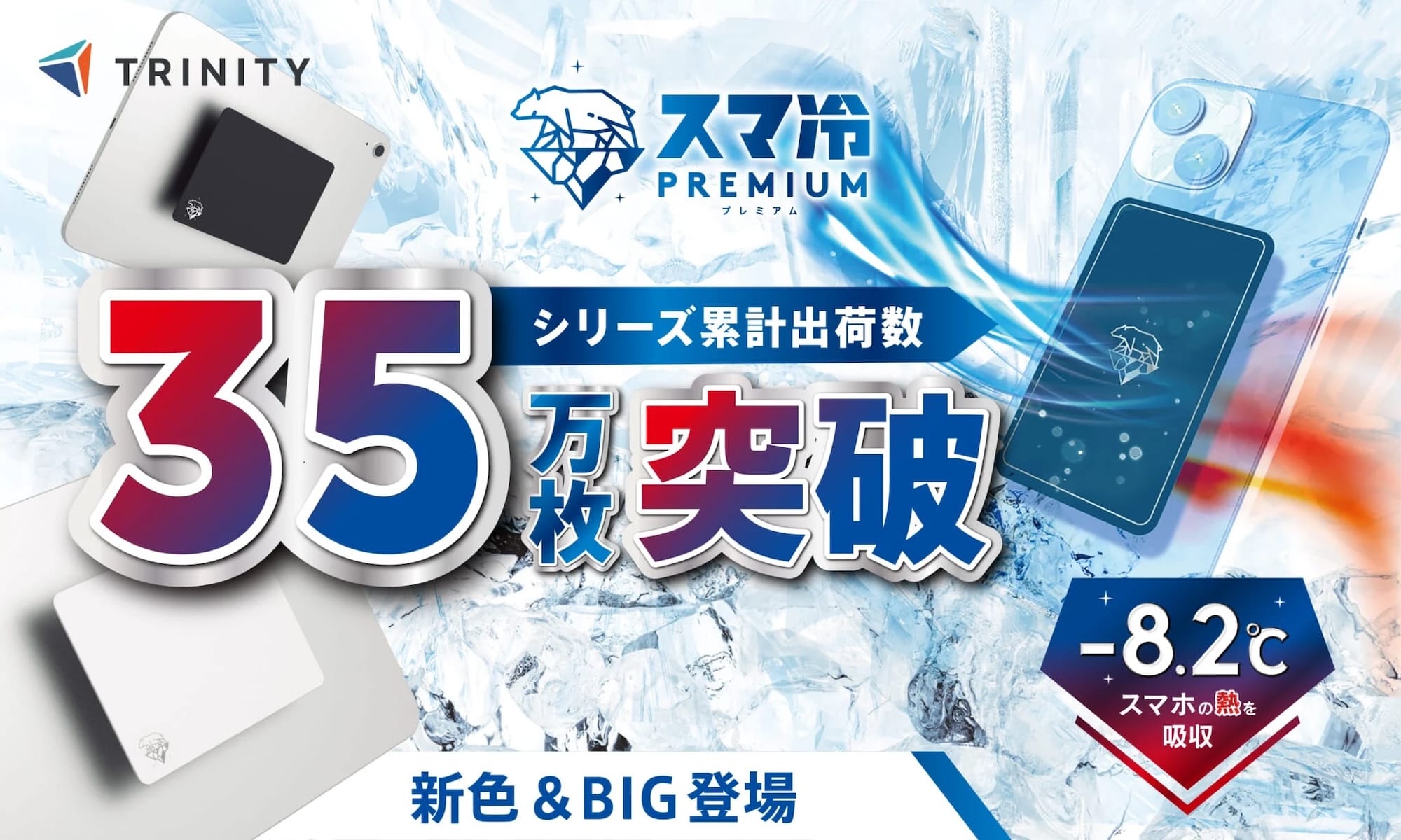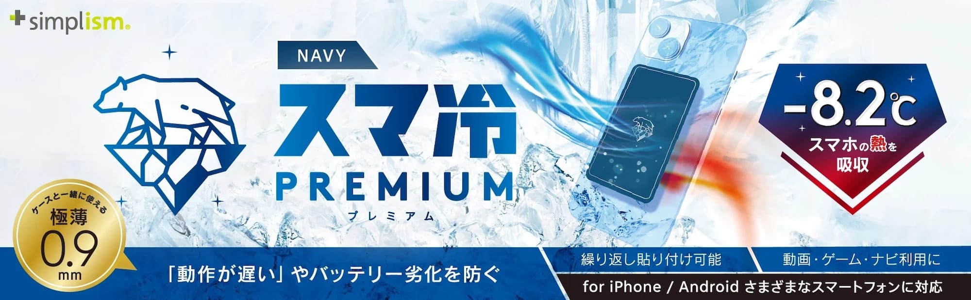 さらに、スマートフォン向けの「スマ冷えPremium」(幅45×高さ75×厚さ0.9mmサイズ)に新色ネイビーを追加しています。