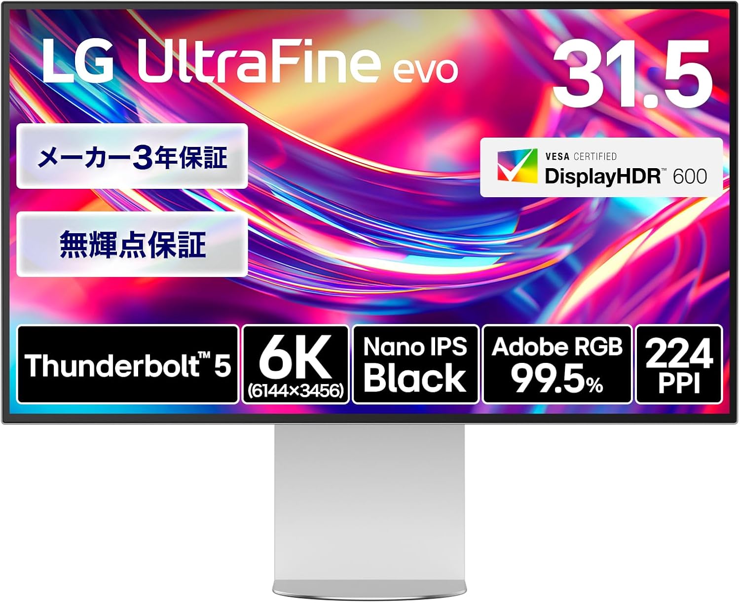 Thunderbolt 5対応31.5インチ6Kモニター。非光沢Nano IPS Blackパネル搭載、表示色約10.7億色、AdobeRGBカバー率99.5%、DCI-P3カバー率98%、ΔE(デルタE)<2、VESA DisplayHDR 600対応。Studio Mode(Mac用カラーチューニング)/M-control(Macのキーボードから輝度とサウンドをコントロール)搭載。KVMスイッチ、USBハブ搭載。スピーカー(5W+5W)内蔵。昇降、ピボット、チルト対応。